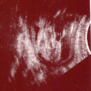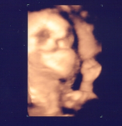 超音波の写真で説明を受けて、3D写真も2枚もらいました。 一応、女の子だという超音波写真です 横顔、口の前でグーって握ってます
