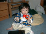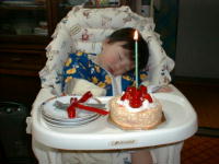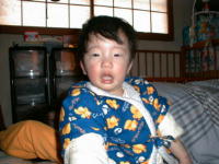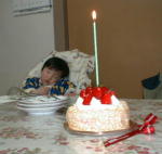 パソコンの電源をいれて画面がつくと、すぐに寄ってきます。 CRTフィルターを取り去り(^_^;)画面を叩いたり、奇声を上げて 楽しく遊びます。 今日は誕生日ケーキを買いに出掛けました。 で、帰ってきて夕食&お風呂を済ませて お風呂に入る前から機嫌が悪くて、泣きじゃくり 仕方ないので、一応記念撮影だけをして