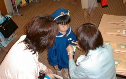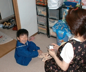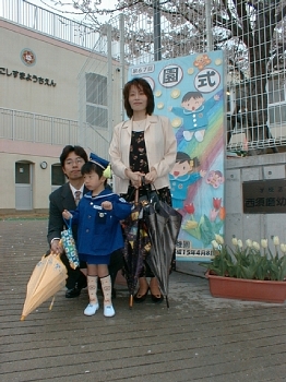 始めて担任の先生と出会って、名札を付けてもらっています。