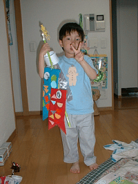 幼稚園で作った鯉のぼりを持ってご機嫌さんの崚太